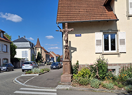 Mehrere Häuser in Rosheim weisen noch heute einen geschnitzten Eckpfosten auf. Dieser aus dem Jahr 1602 zeigt eine Figur in zeitgenössischer Kleidung mit einer markanten Halskrause und einem Dolch. Die Brezel und der lange Laib Brot deuten zudem auf einen Bäcker hin.