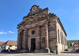 Dating from 1785, this church has retained a Romanesque choir tower from the previous building, dating from the early 13th century. The chosen architect was Nicolas Salins de Montfort, who also designed the Château de Rohan in Saverne. He favored a neoclassical façade style inspired by Paris. In addition to its four Doric columns, the monumental façade is adorned with statues of Saint Odile and Saint Arbogast. The bell tower, preserved from the previous church, dates from the 13th century. The original organ, designed by Albert Silbermann, was transformed in 1926 by Rinkenbach d’Ammerschwir. It now has fifty stops, compared to forty-two previously.