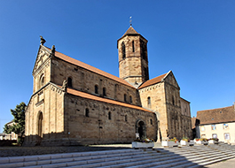 This church replaced an older sanctuary, of which only the two lower floors of the choir tower remain. The entire building dates from the second third of the 12th century, with the exception of the bell tower, which was probably completed after 1286. At the foot of the bell tower, two statues are placed on the roof: on the southern slope, a crouching beggar holding a begging bowl and on the opposite slope, an old man smoothing his beard. The interior of the church impresses above all by its harmonious proportions. This aspect is underlined by the deliberate contrast between the wide blocks and the narrower stones of the walls. The main ornamentation is found on the sculpted capitals, including the famous « headed capital » with its 21 human figures. In order to restore the building to its original appearance, a restoration was undertaken in 1860. New neo-Romanesque furniture replaced the old one, transported to the parish of Rosenwiller. New stained-glass windows were created in this style. The choir vault was then decorated. A century later, in the same spirit of authenticity, the neo-Romanesque elements were removed from the church.