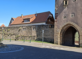 Rosheim only became a key city from the 11th and 12th centuries. In 1236, it was a possession of the Holy Roman Empire. It was then elevated to the rank of « city, » thus leading to the construction of fortifications. The enclosure was flanked by eight circular or semicircular towers, plus the three square gates. The towers were not all built at the same time. The gates and corner towers are contemporary with the wall, the other towers were added in the 15th and 16th centuries. It can be seen that the oblique laying of the rubble allowed the use of uneven stones, in order to reach the height of a course. The western and northern sections of the rampart have disappeared. Defense was provided by the burghers themselves. They were obliged to stand guard, on the ramparts and in the town, the town sergeant marking the gate of anyone who evaded it with a cross. Shooting training, first with the crossbow and then with the arquebus, was essential; the training ground was located a few steps from the ramparts, north of the town. Rosheim never recruited professional soldiers for its defense.
